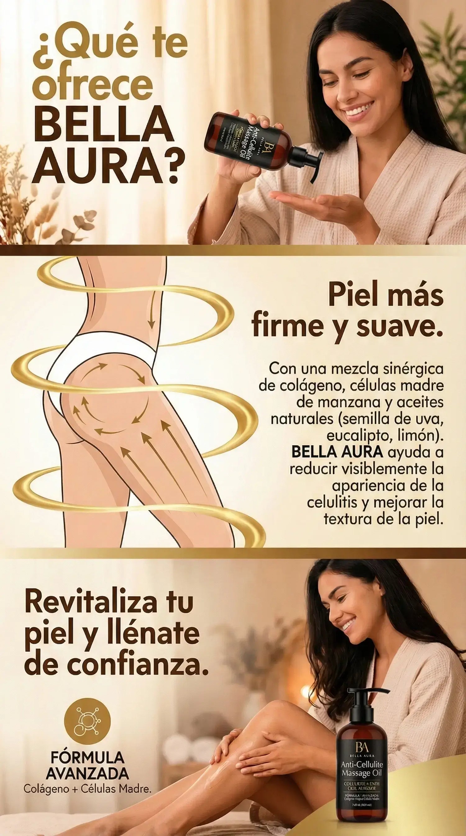 Bella Aura es un aceite corporal de masaje que ayuda a mejorar la textura y firmeza de la piel con el uso constante, dejándola más lisa, hidratada y cuidada, sin rutinas complicadas.